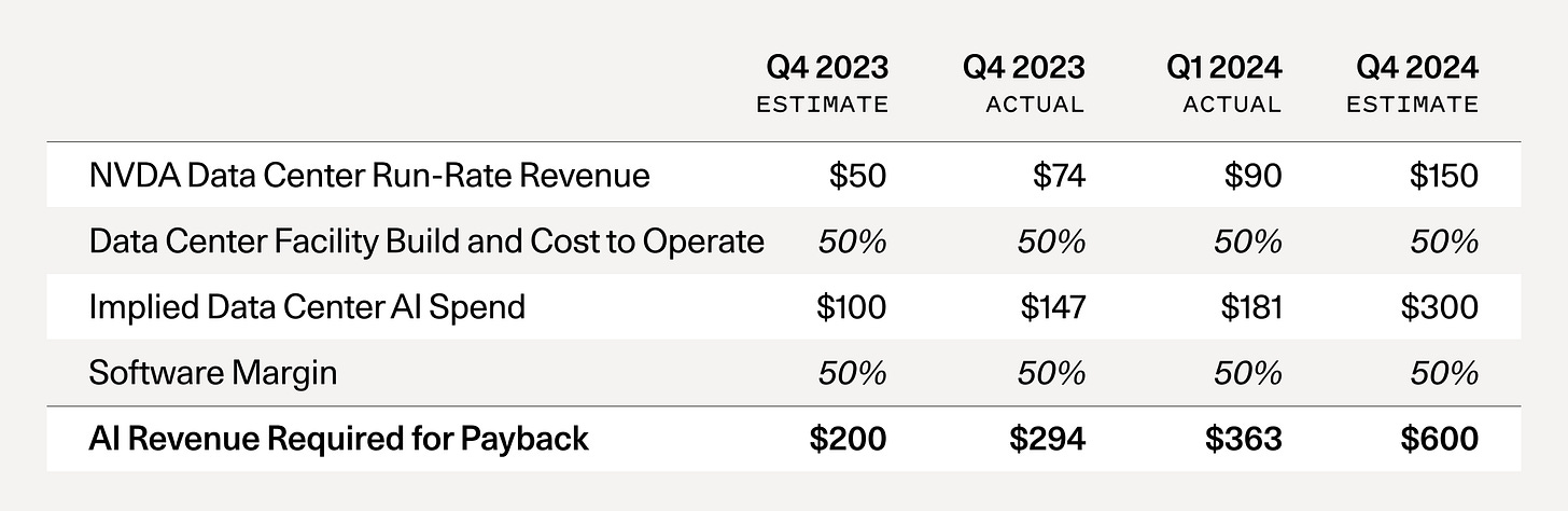 Note: It’s easy to calculate this metric directly. All you have to do is to take Nvidia’s run-rate revenue forecast and multiply it by 2x to reflect the total cost of AI data centers (GPUs are half of the total cost of ownership—the other half includes energy, buildings, backup generators, etc).*1 Then you multiply by 2x again, to reflect a 50% gross margin for the end-user of the GPU, (e.g., the startup or business buying AI compute from Azure or AWS or GCP, who needs to make money as well).
